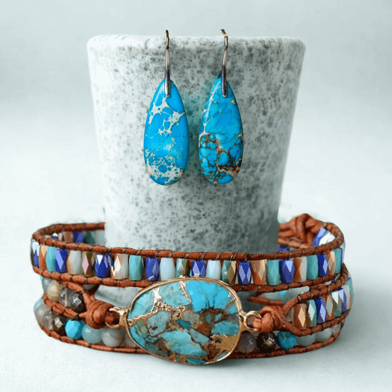 Navodno sadrži snažnu kombinaciju ljekovitog kamenja! Ručno izrađena s ljubavlju, s carskim jaspisom, amazonitom i tirkizom u središtu. Ova kombinacija triju prirodnih kamenja omogućuje ultimativnu ljekovitu, zaštitnu, uravnotežujuću, umirujuću i uzdižuću narukvicu zbog koje ćete se osjećati poput božice.
